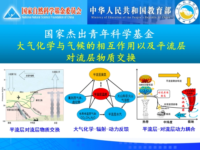 国家自然科学基金杰出科学青年基金项目“大气化学与气候的相互作用以及平流层对流层物质交换(项目号:41225018)”于2013年1月开始实施。项目的重点研究内容是评估气候变化和人类排放变化背景下臭氧层的恢复特征以及臭氧层的恢复对气候的影响;诊断平流层与对流层物质交换(STE)的特征及其对平流层和对流层内的化学过程和大气成分浓度的影响;探索平流层和对流层大气之间的化学-辐射-动力耦合及相互影响,重点分析QBO和极涡变化等平流层过程与对流层天气气候变化之间的内在联系和相互作用。